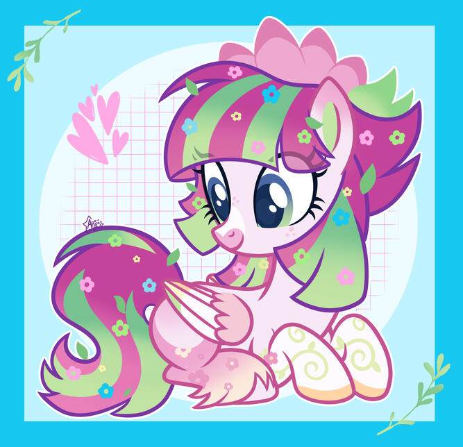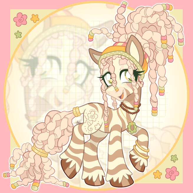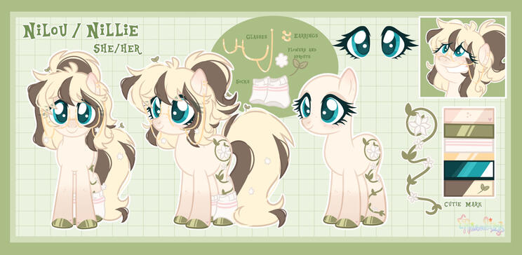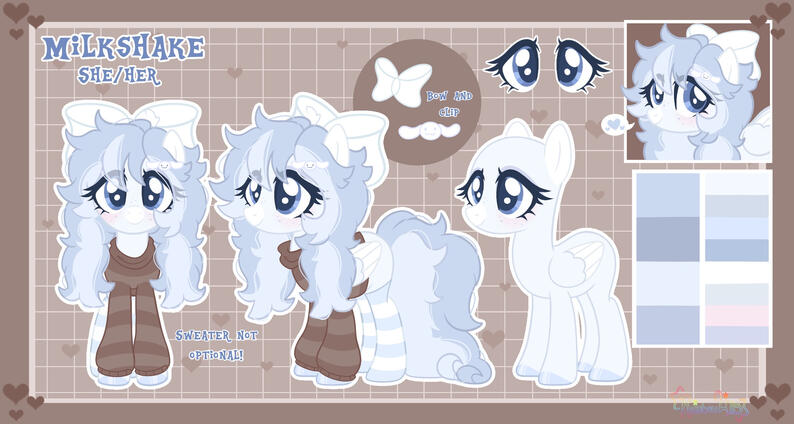 Includes front view and two 3/4 views (one with mane+tail and another without), color guide, cutie mark ref, accessory ref, headshot of character